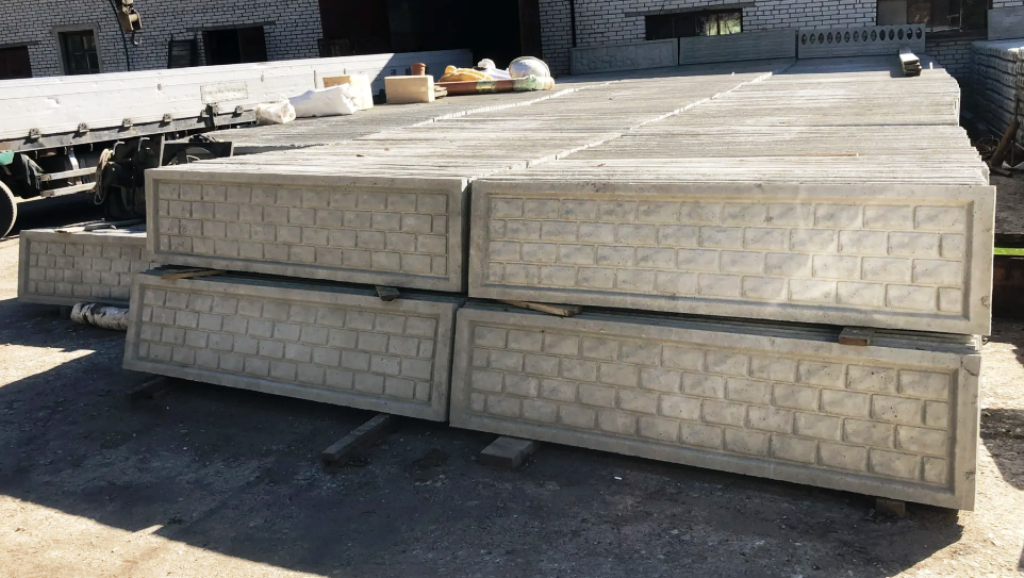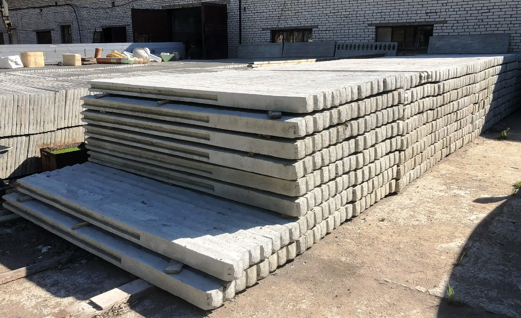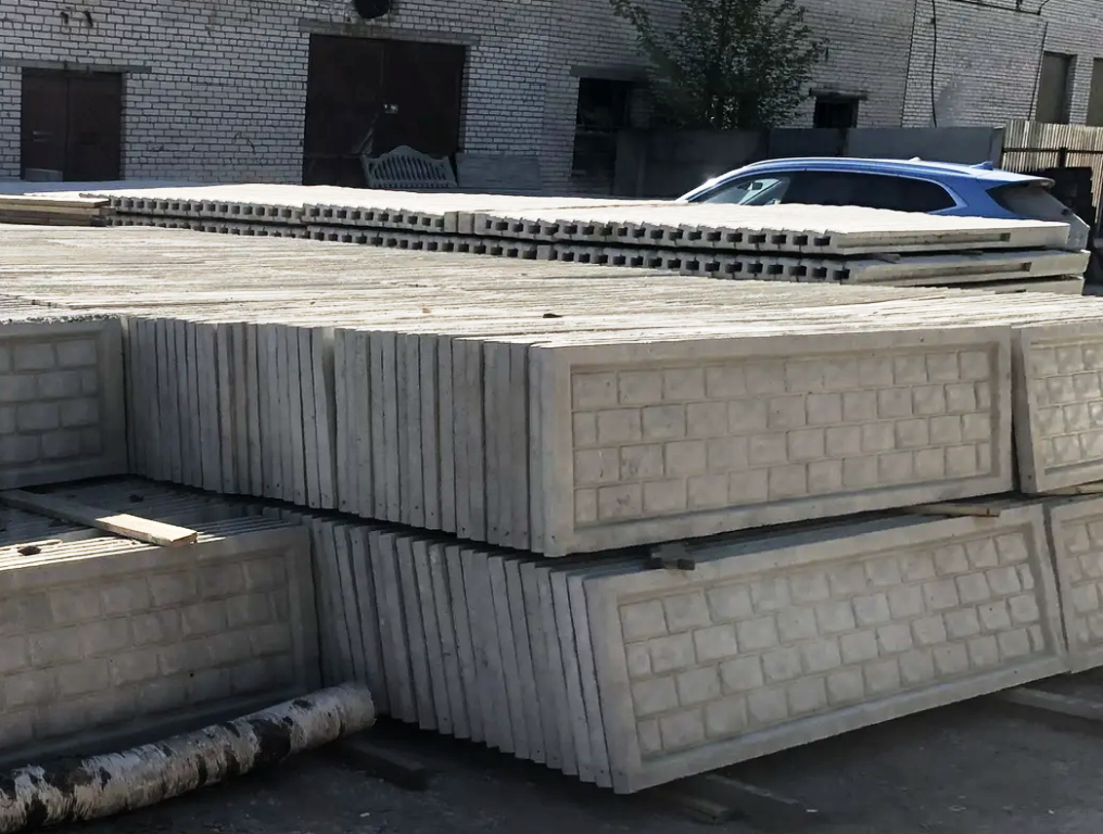 Забор состоит из отдельных бетонных секций (плит) и опорных столбов. В одном пролёте размещается 3–4 секции — это позволяет подобрать оптимальную высоту ограждения под ваши задачи.