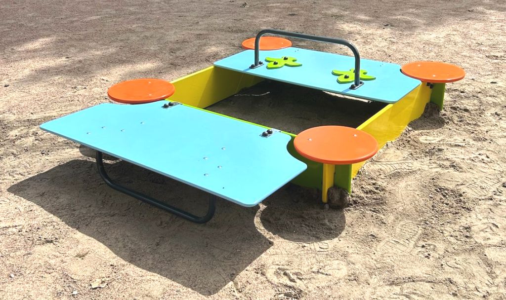 Красивая и практичная детская песочница размером 1.2×1.2 м, с двумя крышками‑лавками на петлях. Крышки открываются для доступа к песку и закрываются, защищая песок от осадков, мусора и животных — при этом служат сиденьями для ребёнка и взрослого.