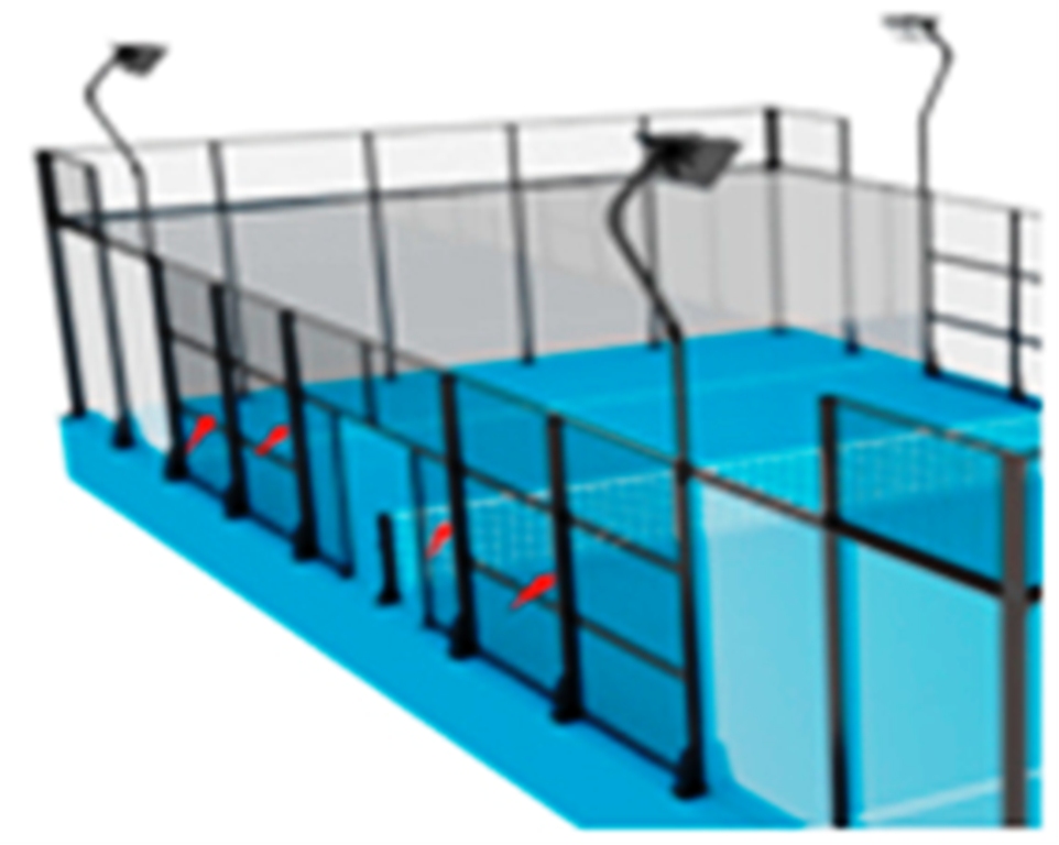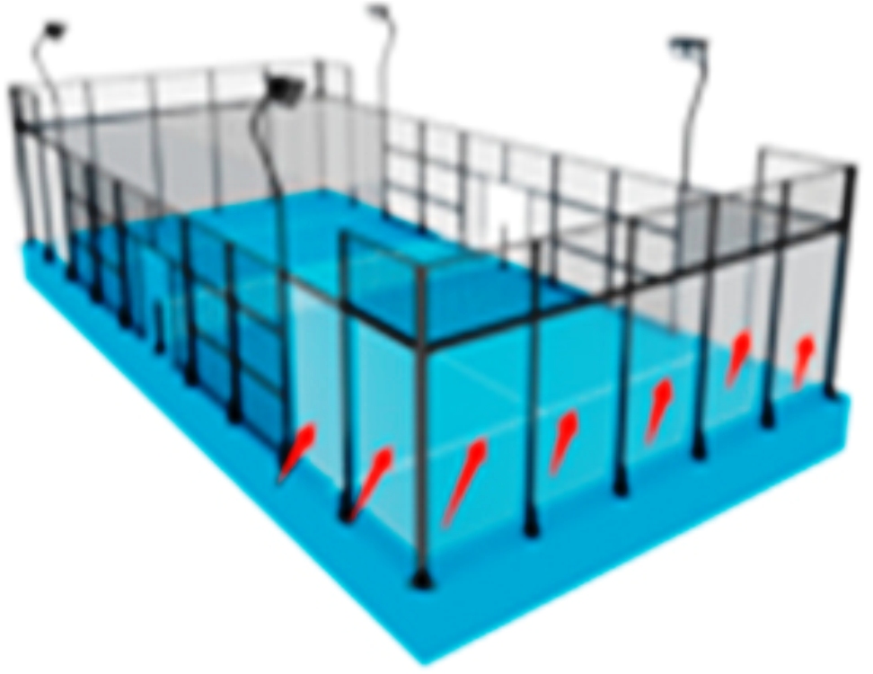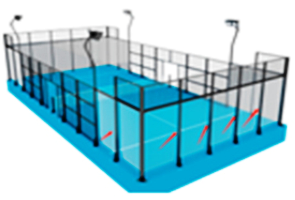 Освещение падел-корта обеспечивает оптимальную освещенность и равномерность по всем игровым зонам. От сетки до зон доступа, фона, боковых линий и зон высоких мячей наше решение по освещению устраняет блики и тени во время игры, предоставляя игрокам хорошую видимость и качество игры. 8 светильников мощностью 200Вт с LED-подсветкой адаптированы к широкому диапазону напряжения от 90 до 240В, с защитой IP65, могут использоваться во всех странах. Стойки освещения крепятся и фиксируются к конструкции корта, доступны различные формы на выбор.