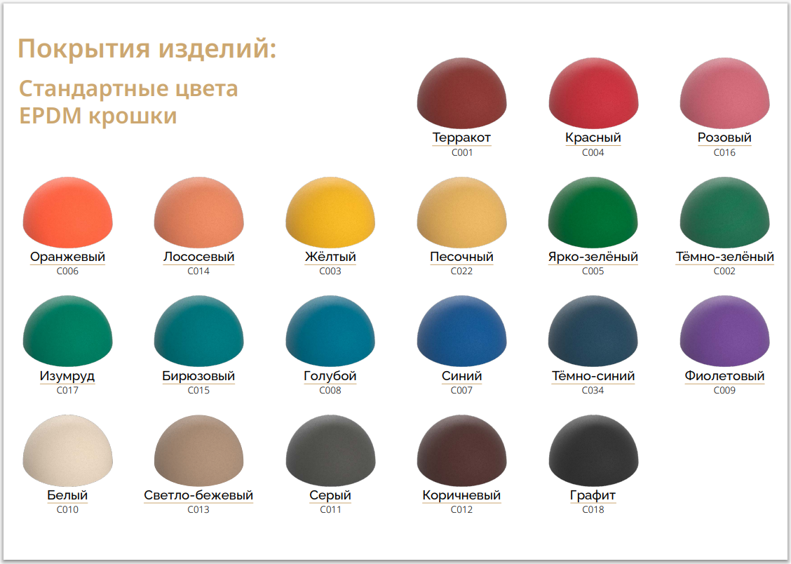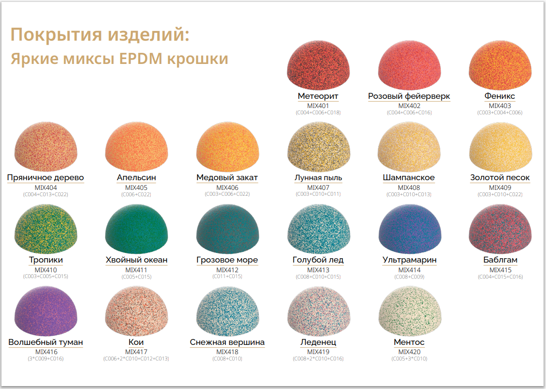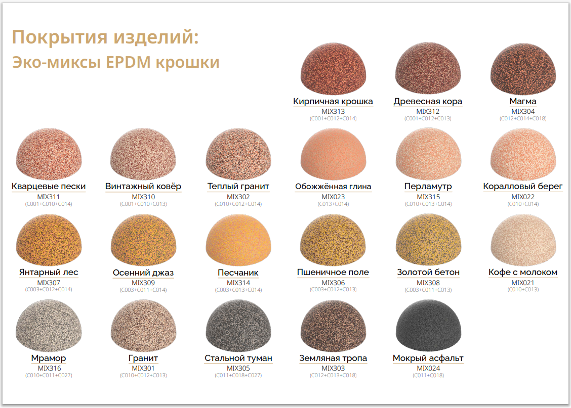 • Изделия из EPDM крошки на алифатическом нежелтеющем связующем, стандартные цвета: