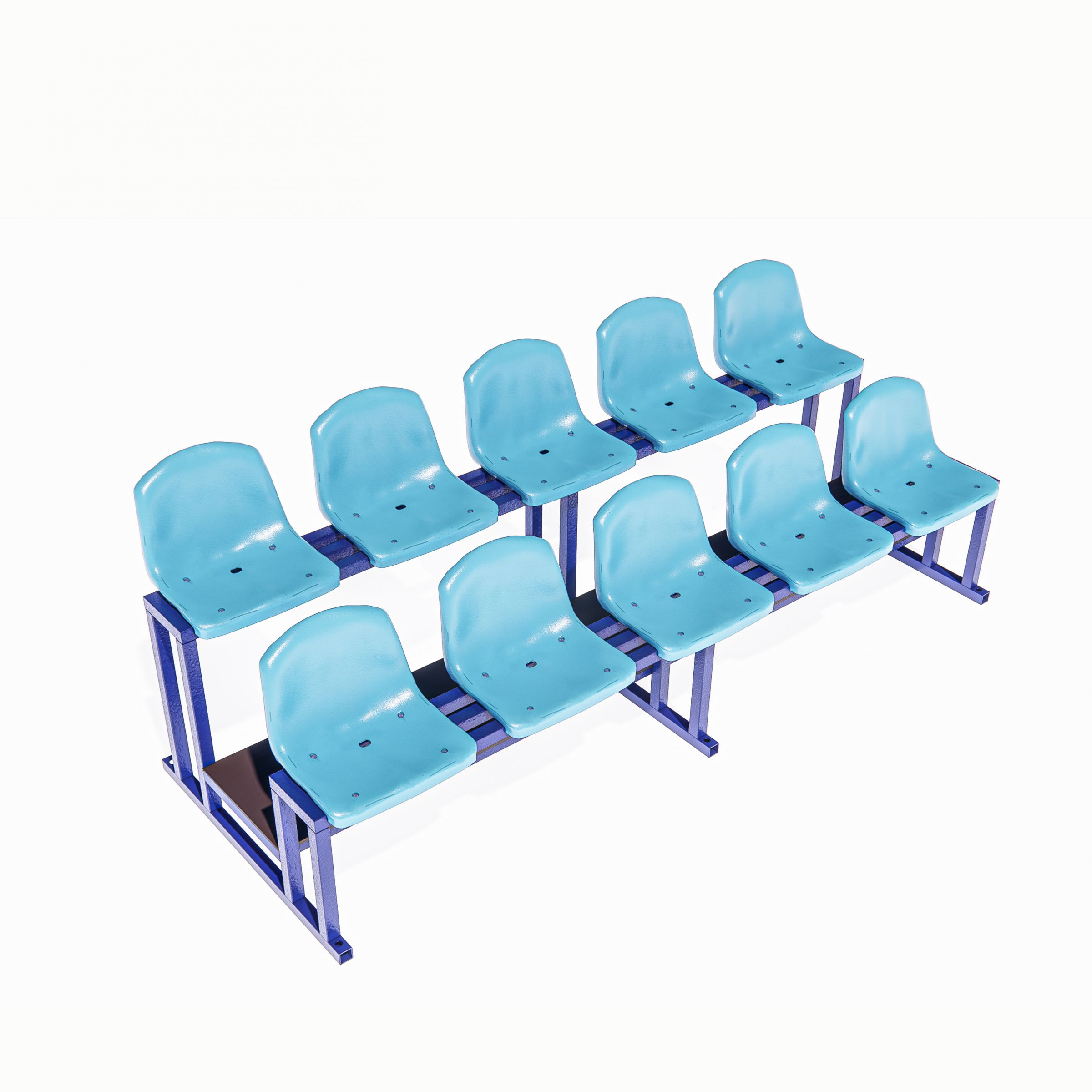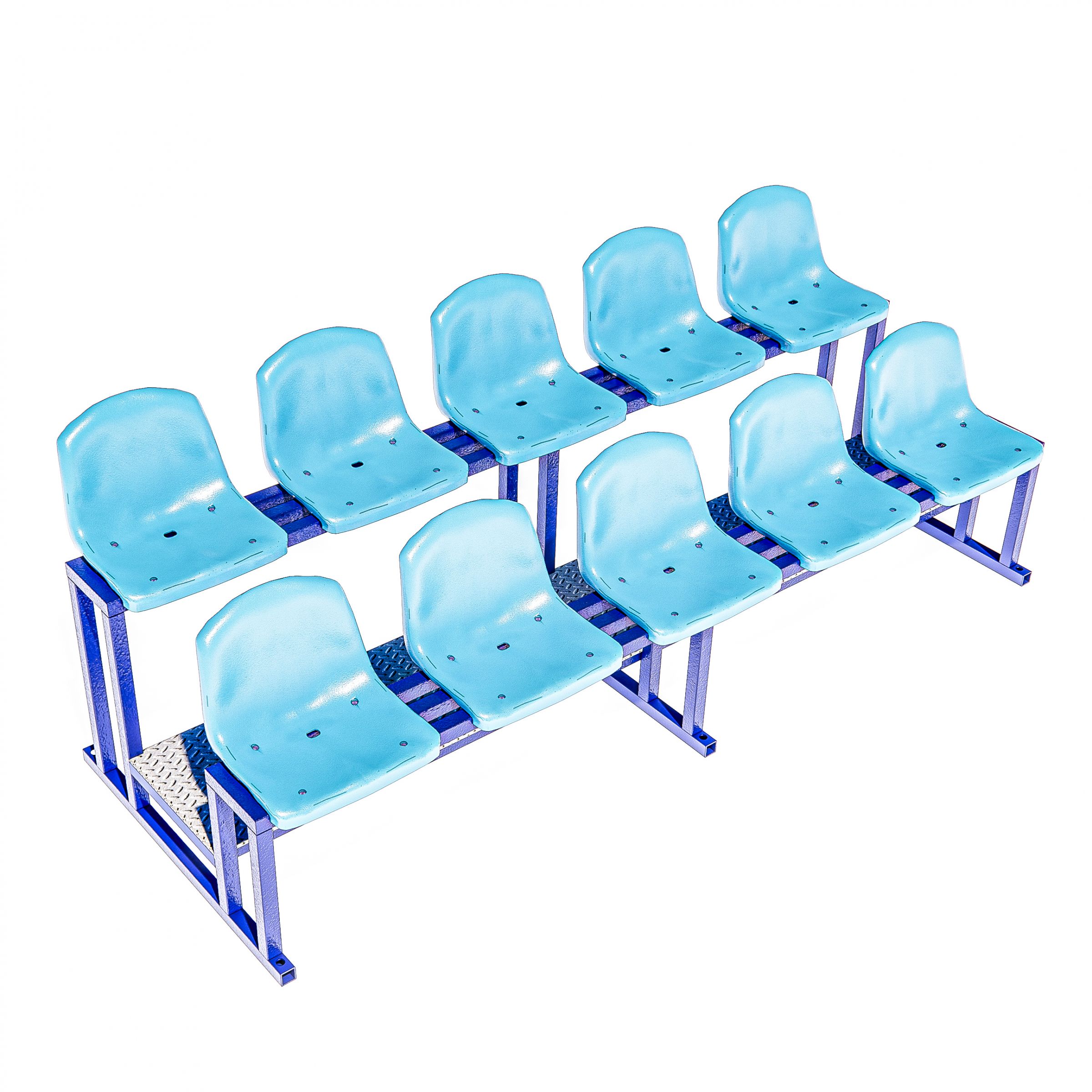 Секция трибуны стационарная 10-и местная в 2 ряда с проходом между рядами из ламинированной фанеры или рифлёного металла, с рисунком "чечевица", для спортивных залов или открытых спортивных площадок представляет собой металлоконструкцию, изготавливаемую из стальной прямоугольной трубы. Оснащается пластиковыми сидениями.