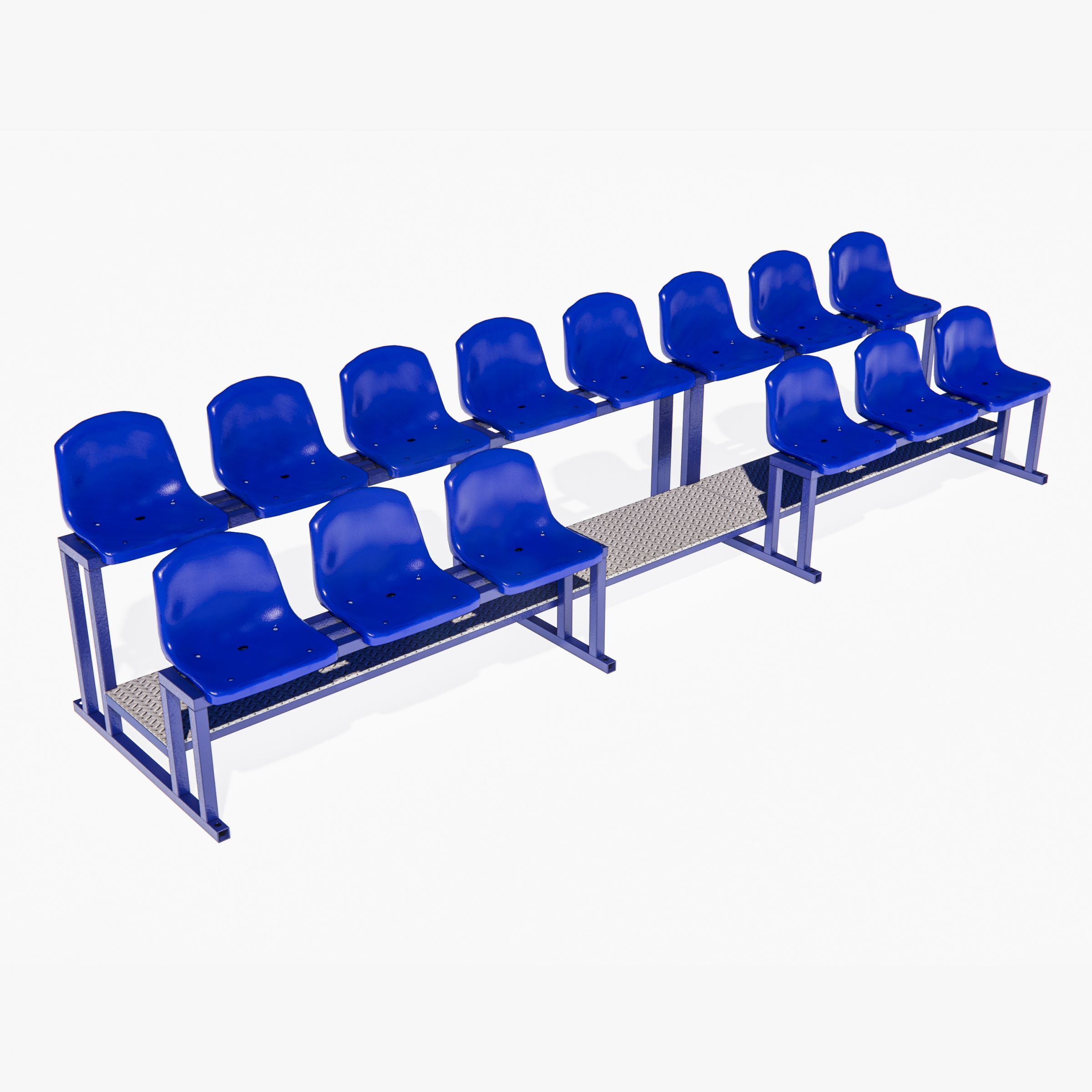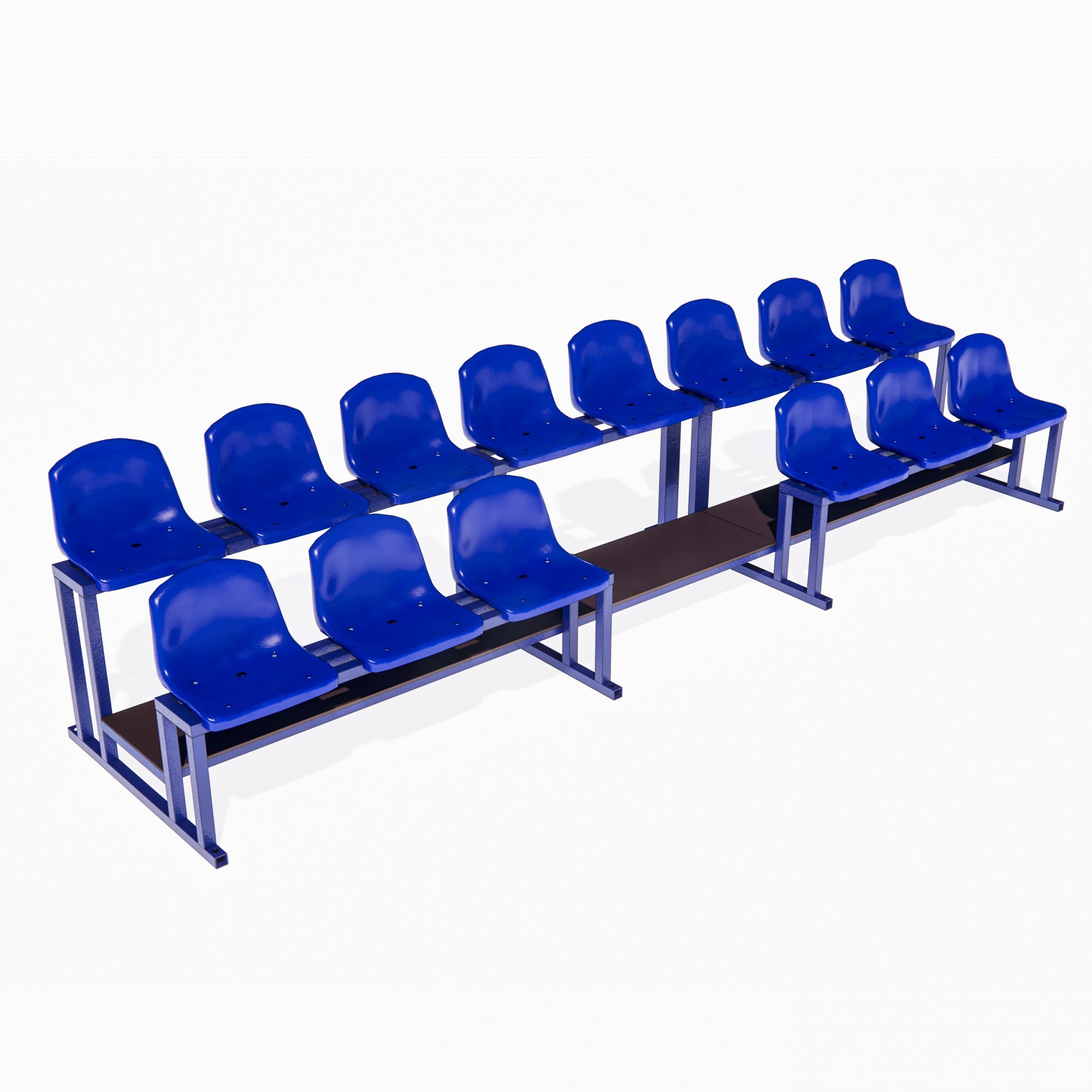 Секция трибуны стационарная 14-и местная в 2 ряда с проходом между рядами из ламинированной фанеры или рифлёного металла, с рисунком "чечевица", для спортивных залов или открытых спортивных площадок представляет собой металлоконструкцию, изготавливаемую из стальной прямоугольной трубы. Оснащается пластиковыми сидениями.
