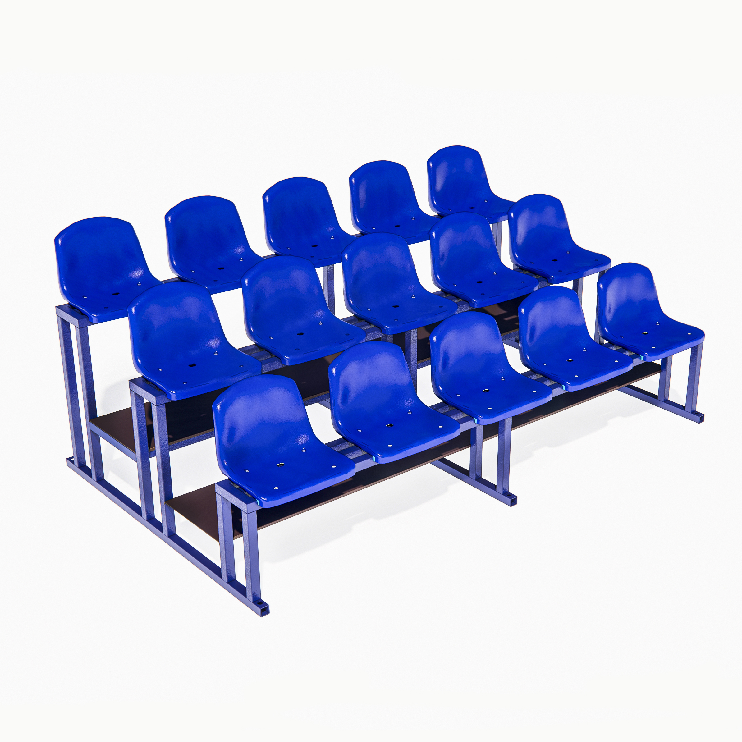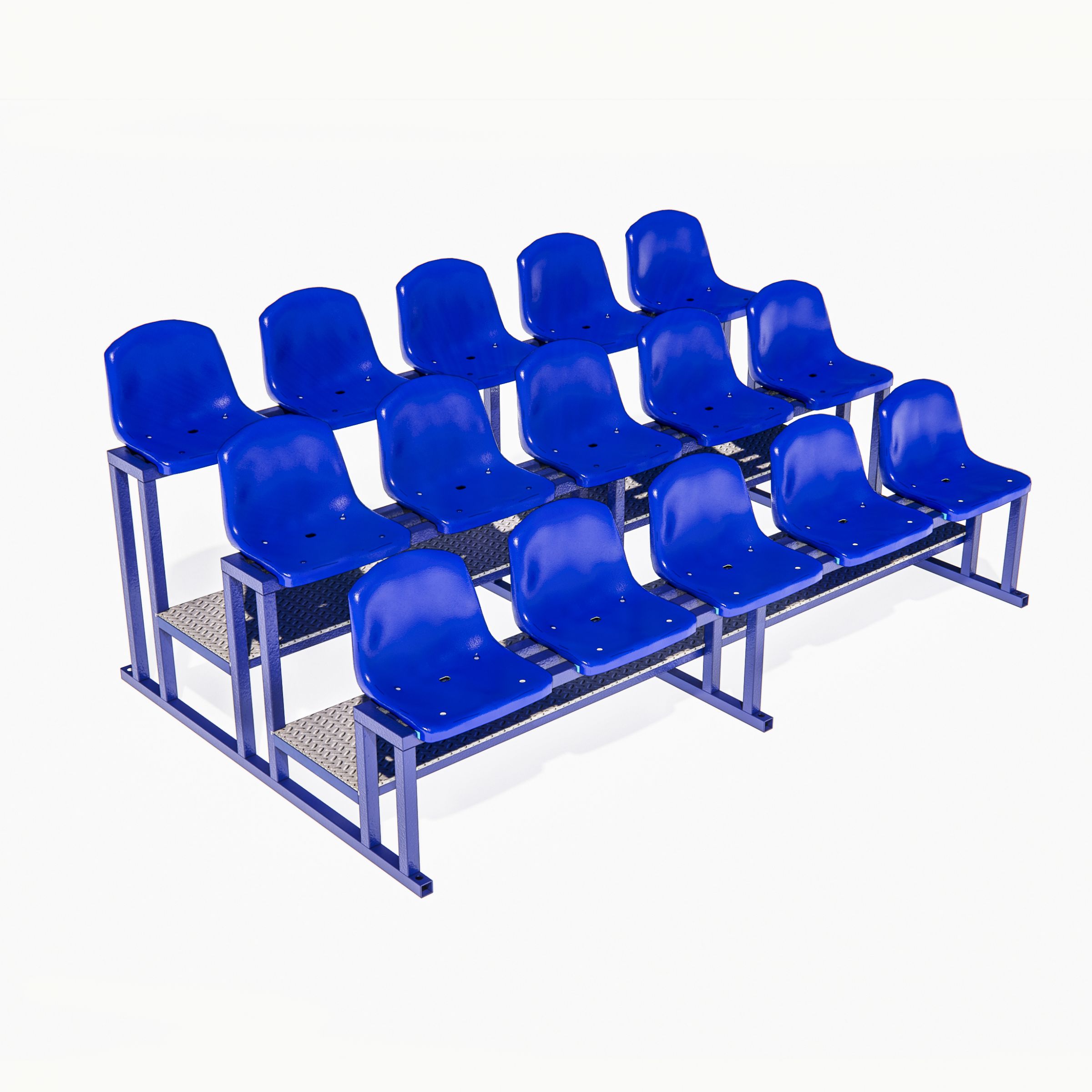 Секция трибуны стационарная 15-и местная в 3 ряда с проходом между рядами из ламинированной фанеры или рифлёного металла, с рисунком "чечевица", для спортивных залов или открытых спортивных площадок представляет собой металлоконструкцию, изготавливаемую из стальной прямоугольной трубы. Оснащается пластиковыми сидениями.